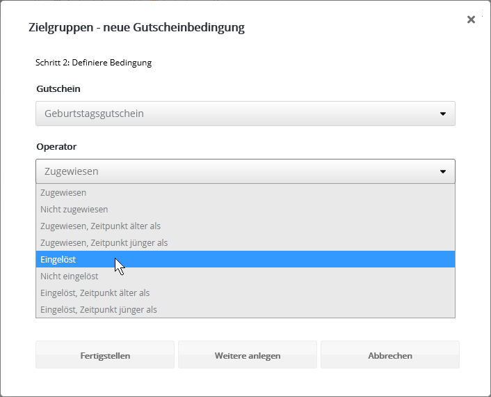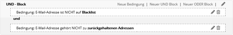 Insbesondere nach dem Kopieren einer vorhandenen Zielgruppe kann das sinnvoll sein, wenn die identischen Abonnenten in Original und Kopie nicht gewünscht sind. Bedingung anhand GutscheinFiltern Sie Abonnenten danach, ob und in welchem Zeitraum die Zuweisung oder Einlösung eines Gutscheins stattfand. Tipp: Um zugewiesene Gutscheine als eingelöst zu markieren, nutzen Sie entweder die Webservice-Funktion 'RedeemVoucherByCode' oder importieren in der Gutscheinübersicht eine CSV-Datei mit den eingelösten Gutscheincodes. Bedingung anhand SelektionMit diesem Bedingungstyp nutzen Sie eine per Webservice angelegte Selektion von Abonnenten als Chili-Newsletter-Software-Zielgruppe. Der Bedingungstyp ist nur dann sichtbar, wenn per Webservice mindestens eine Selektion angelegt wurde. Das Besondere: In einer Selektion werden Abonnenten anhand einer Liste von IDs gruppiert. So lässt sich eine extern getroffene Abonnentenauswahl als Zielgruppe nutzen, ohne dass in den Chili-Newsletter-Software-Abonnentendaten ein gemeinsames Merkmal vorliegen muss. Die Details entnehmen Sie bitte der Webservice-Dokumentation, die wir Ihnen gern zusenden. Bedingung anhand des Empfängers (geplant)Diese Bedingung entscheidet, ob ein Abonnent als Empfänger eines bestimmten Mailings vorgesehen war oder nicht. Das bedeutet, dass er in einer Abonnentenliste bzw. Zielgruppe für ein bestimmtes Mailing steht, welches versandt wurde. Im Unterschied zur letztgenannten Bedingung wird der tatsächliche Empfang jedoch nicht geprüft. Es sind auch alle Empfänger enthalten, die das Mailing z. B. aufgrund von Bounces, Blacklists oder serversseitigen Spamfiltern nicht empfangen haben. Bedingung anhand des Empfangens (zugestellt)Diese Bedingung entscheidet, ob jemand ein bestimmtes Mailing empfangen hat oder nicht. Das Mailing gilt als empfangen, wenn der E-Mail-Server des Abonnenten eine positive Rückmeldung erteilt hat. Im Schritt nach dem Empfang ist es dennoch möglich, dass das Mailing beim Empfänger in einem Spamordner landet. Bedingung anhand des BounceverhaltensDamit legen Sie Bedingungen anhand der Zustellungen oder Nichtzustellungen eines bestimmten Mailings an. Bedingung anhand Blacklist bzw. Zurückgehaltener AdressenAbonnenten, deren E-Mail-Adresse auf einer Blacklist oder der Liste der zurückgehaltenen Adressen steht, werden automatisch vom Versand ausgeschlossen. Dieselben* Abonnenten lassen sich per Zielgruppe filtern, etwa um sie beim Export Ihrer Abonnentendaten ebenfalls auszuschließen. Die kombinierte Zielgruppe sieht wie folgt aus: