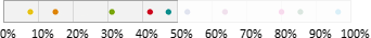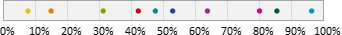 Auswahl-Wahrscheinlichkeit in ProzentGeben Sie einen Prozentwert zwischen 0 und 100% ein. Mit dieser Wahrscheinlichkeit gehört ein Abonnent zur Zielgruppe. Beispielsweise bewirkt ein Wert von 25%, dass ungefähr (siehe Hinweis) ein Viertel aller Abonnenten zur Zielgruppe gehören. Dazu verteilt Chili-Newsletter-Software alle Abonnenten auf einem Zahlenstrahl zwischen 0 und 100%. Bei 10 "bunten" Abonnenten könnte eine Variante so aussehen: