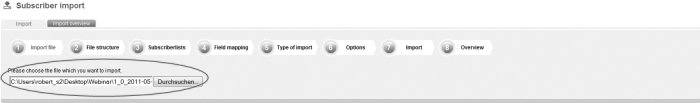 Save the file as a file with the feature 'CSV (Comma delimited)'. Apple user: If you own an apple computer, you will have to safe the file as 'CSV-Windows'. Chili-Newsletter-Software does not run files in the Mac format. Step 1 – Import fileOn the navigation bar click on 'Subscribers' and then go to the navigation subitem 'Import'. This is the way how you get to the menu-guided import function of Chili-Newsletter-Software. First, you will have to choose the file which you want to import; |