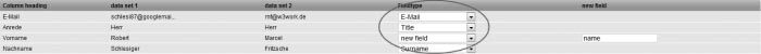 if the first line of your address file contains (as shown in the example above) the column headings, leave the item 'First line contains column headings' marked . Otherwise, if your address file starts right away with the subscriber data, unmark this option. Step 3 – Subscriber ListsChoose the subscriber list to which you want to import the addresses. Subsequently click on 'Next'. Step 4 – Field MappingNow you are asked to match the field names of your subscriber data with those of Chili-Newsletter-Software. In order to do so, please choose in the drop down menus the associations which correspond to field information displayed to the left of these menus. If there does not exist a matching subscriber field, choose 'New Field' and enter a name for the subscriber field that needs to be created. Click 'Next'.