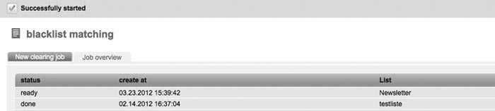 | You will find information on the blacklist and its function in 2.11 Blacklist. Via the function 'Blacklist matching', you can coordinate the data records of your subscriber lists with the entries in your blacklist. Detected subscribers will automatically be deleted by Chili-Newsletter-Software. First, you have got to choose the subscriber list which has to be examined. By clicking the 'OK' button, you will confirm the appearing message to delete the search results. The result will show you how many subscribers were removed due to the fact that they are registered in the blacklist. |