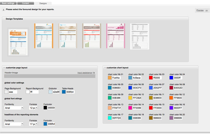 Now you also can adjust the design of your report. Choose the tab 'designs'. By default Chili-Newsletter-Software suggests you six different layouts. HTML experts can also open the 'advanced settings' below the layouts to edit the html-code. For example you can insert your logo in th header.