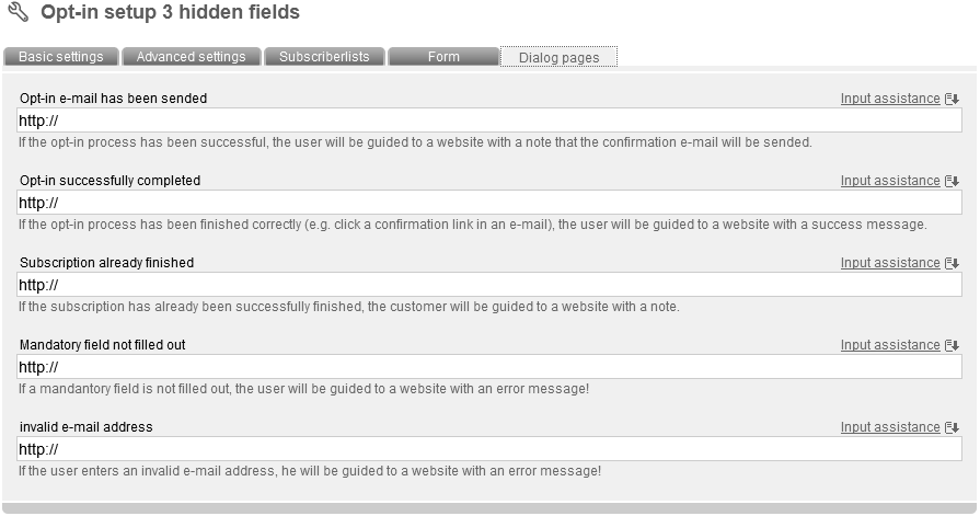 Now enter a name and an optional description for your optin setup. Then choose the 'mode' (important). The following modes are supported by 'Chili-Newsletter-Software': Double Opt-in with confirmation e-mail (recommended as the only legally secure login variant): Interested party visits a website with an optin setup form. He enters his data into the form. He gots an e-mail with content like this: „Thank you for your optin. Please confirm the registration confirmation link to complete your registration.“ He clicks the link. Registration is completed. He gots a „welcoming“ e-mail. You can integrate information about your company and a certain design as well. Double Opt-in: Like described before, but without sending of a „welcoming“ e-mail. Confirmed Opt-In: Nach Anmeldung auf der Webseite wird sofort eine automatische Begrüßungsnachricht versendet. Single Opt-in: No e-mails will be send. There just will be a message in your browser, that registration was successfull. According to the mode you've choosed, you have to adapt different sub-options. In Tab 'advanced settings' you can deposit your e-mail address in field 'e-mail forwarding', to be informed about new subscribers. In field 'mailing for later delivery' you can determine your last sended newsletter. All new subscribers will receive your last mailing and don't have to wait for another one. To protect your optin-form against abuse, activate the invisible captcha . Captchas are often used to check if petitions are produced by a machine (robot, short: bot) or a real person. Bots are often used abusive to generate masses of subscriptions. Choose your favorite subscriberfields, which should be filled in in next tab 'Form'. After clicking 'Add subscriberfield' a pop up appears, where you can select and add subscriberfields to your optin-form. Furthermore you can add one or more subscriberlists as option(s) in a ceckbox through the button 'add subscriberlist'. Click 'sort formfields' to edit order of your fields. Click 'test form' to check your form by a preview of your optin-form. Next tab: 'Dialog pages':