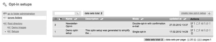 Through 'Setups' and 'Optin Setup' you can create forms, which can be included into your website. So interested parties can login automatically on your website for your subscriberlist(s). Please note: Requirement for a successfull 'optin setup' is to create an e-mail with type 'dialog mailing' for registration confirmation and welcoming, which got the status 'activated'. Otherwise those mailings will be lacking in the shortlist of mailings which you can choose for your optin setup. For an esier start Chili-Newsletter-Software gots a „Demo optin setup“ for you. Created optin setups can be 'opend' afterwards for editing, 'moving' to another folder or 'deleting'. If you have moved an optin setup into another folder, click 'open folder' to get into. Create new Optin setup |
