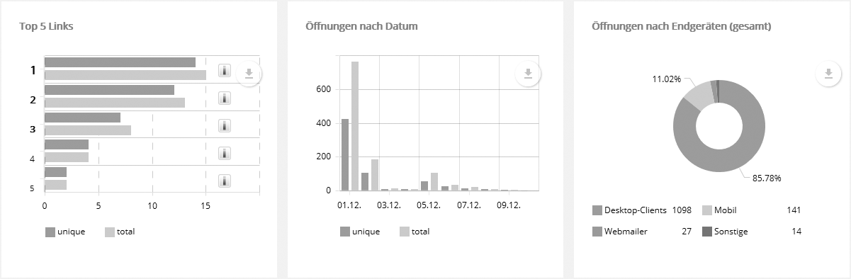 Per Klick auf 'Vollbild' wird die Karte im gesamten Fenster dargestellt. Direkt unter dem Vollbild-Link können Sie per Download-Button die Grafik der Karte in verschiedenen Formaten herunterladen. Hinweis: Obwohl IP-Adressen grundsätzlich nicht an einen bestimmten Ort gebunden sind, lässt sich durch die bekannten IP Adressräume von Internetprovidern, Universitäten und ähnlichen Einrichtungen in vielen Fällen der Standort ermitteln. Da regionale Einwahlknoten häufig einen festen IP-Adresspool besitzen, funktioniert das Verfahren auch bei dynamischer IP-Vergabe. Für die Zuordnung nutzt Chili-Newsletter-Software eine regelmäßig aktualisierte lokale Kopie einer Geotargeting-Datenbank, die ein externer Dienstleister zur Verfügung stellt. --> Top 5 Links + Öffnungen nach Datum und EndgerätenWie bei jedem anderen Diagramm lassen sich auch hier per Download-Button (rechte obere Ecke) die angezeigten Daten als Grafik- oder Excel-Datei herunterladen. Einzelne Diagramm-Segmente lassen sich ein- oder ausblenden, indem man auf den entsprechenden Punkt in der Legende klickt, z.B. auf 'Desktop-Clients' im Diagramm 'Öffnungen nach Endgeräten'. Damit werden die übrigen Segmente auf 360° gezoomt und deren Prozentzahlen passen sich der neuen Anordnung an. So lässt sich das Verhältnis beliebiger Segmente direkt vergleichen.