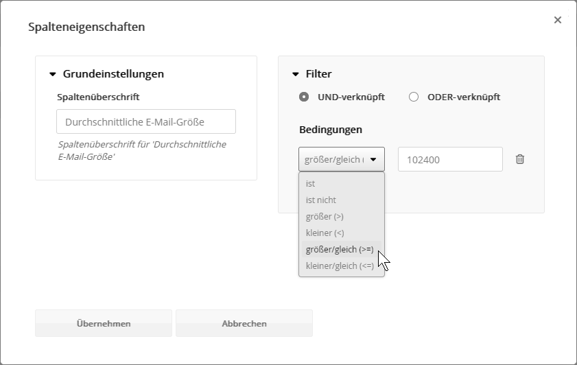Beim Bearbeiten jeder Spalte können Sie Filter definieren, um abhängig vom Spaltenwert irrelevante Daten aus dem Export zu entfernen.