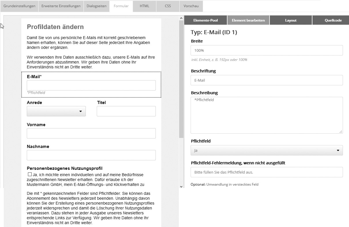 Wählen Sie in der Vorschau ein Element, öffnet sich rechts der Tab 'Element bearbeiten'. Der folgende Screenshot zeigt dies am Beispiel des 'E-Mail'-Feldes: